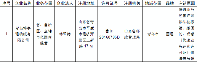 根据《中华人民共和国邮政法》、《中华人民共和国行政许可法》的相关规定,依照《快递业务经营许可管理办法》,依法注销以下企业的快递业务经营许可,现予公告。